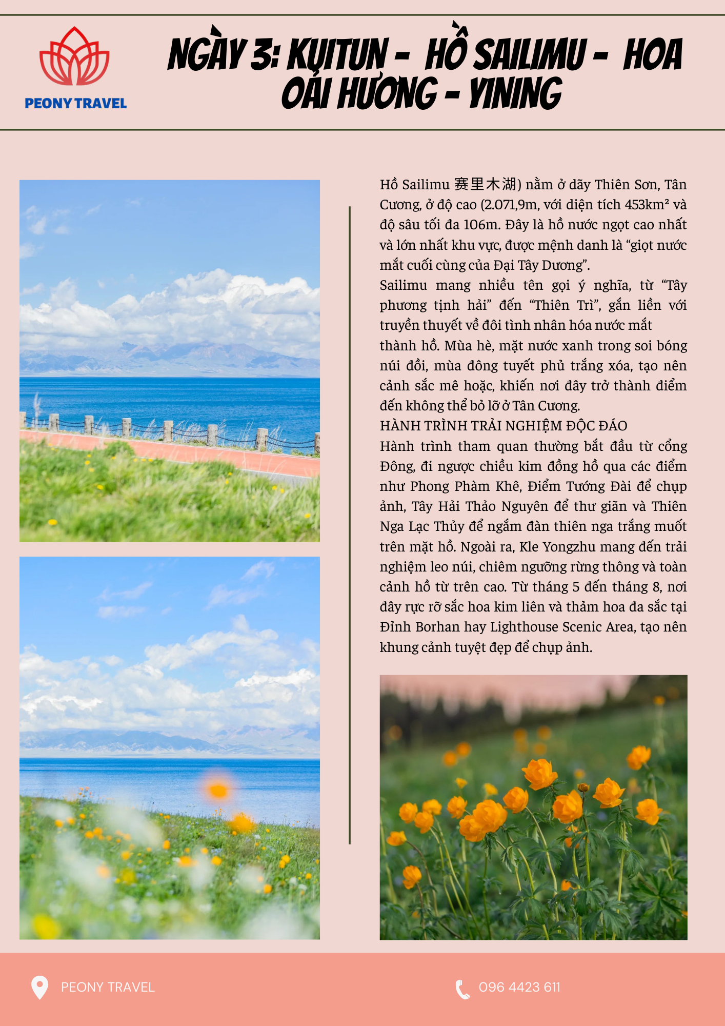 - Hành trình: Kuitun - Tự lái xe đến Hồ Sailimu - Chụp ảnh du lịch tại Hồ Sailimu - Cánh đồng hoa oải hương - Yining