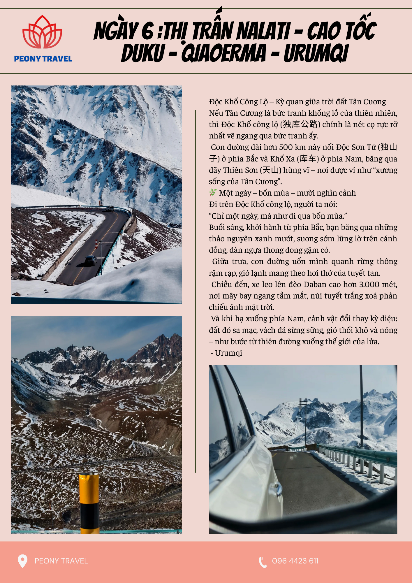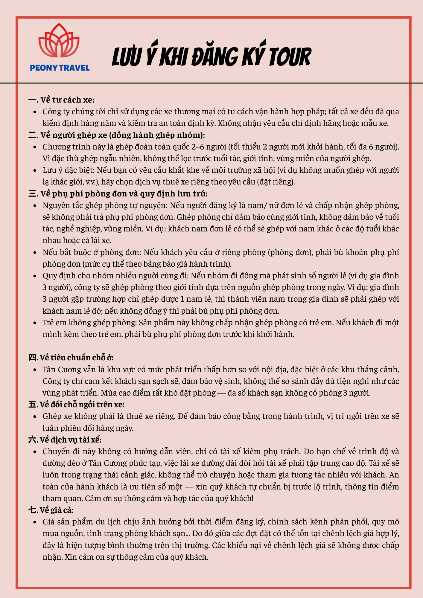 - Do tính chất đặc biệt của đường ở Tân Cương, công ty chúng tôi có quyền điều chỉnh hành trình trong trường hợp thời tiết hoặc bất khả kháng. Do khí hậu đặc biệt của Tân Cương nên thỉnh thoảng có thể xảy ra trường hợp bất khả kháng. Xin hãy thông cảm!