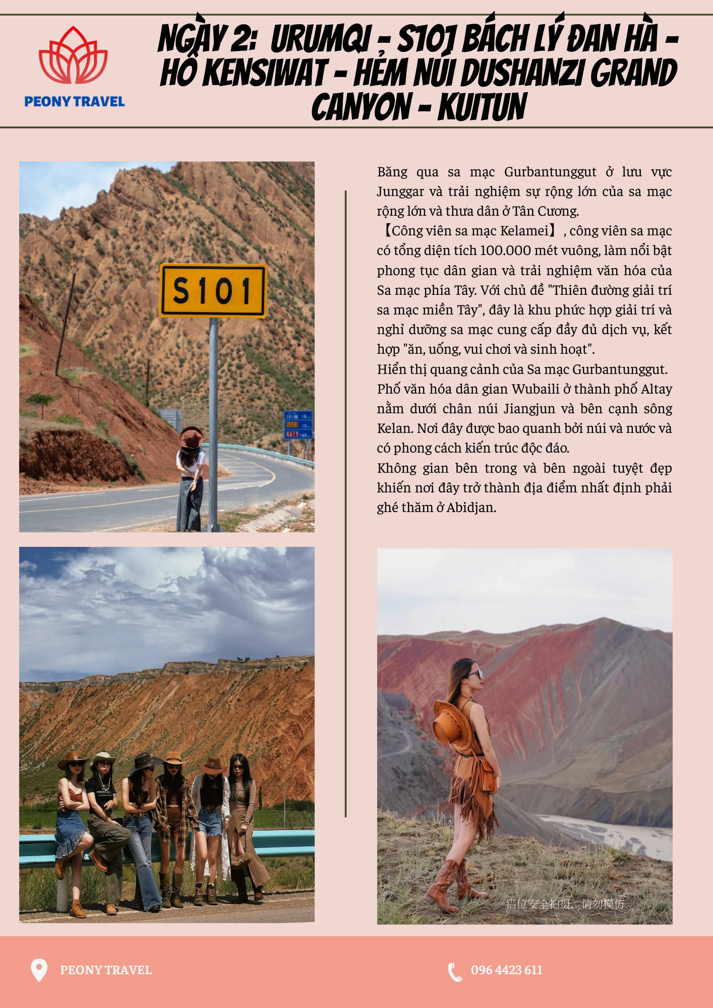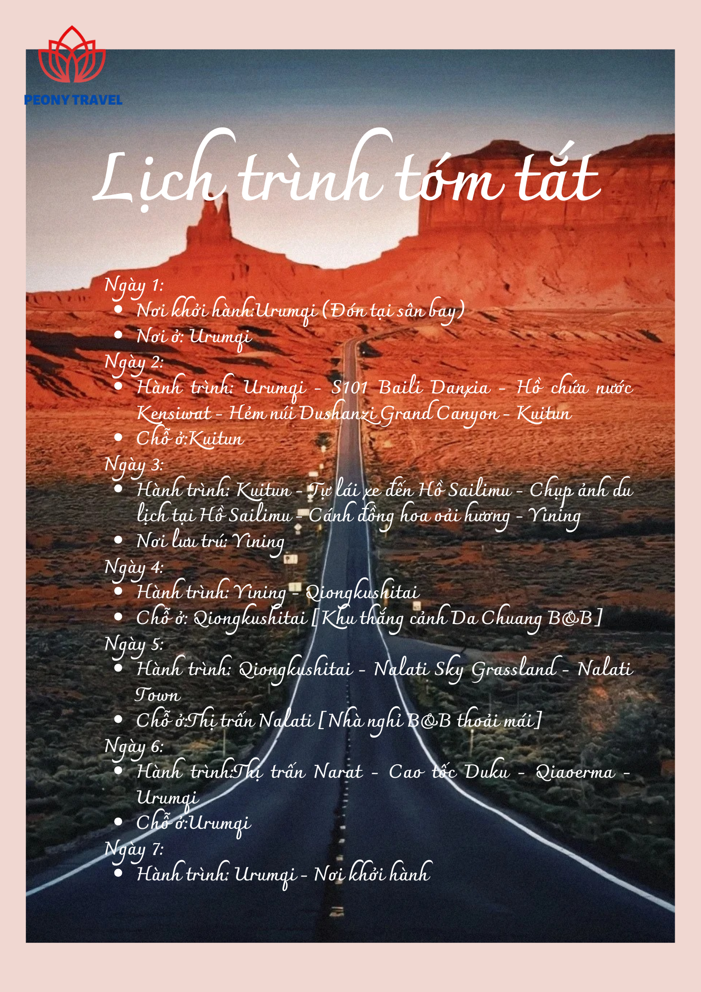 - Hành trình: Urumqi - S101 Baili Danxia - Hồ chứa nước Kensiwat - Hẻm núi Dushanzi Grand Canyon - Kuitun